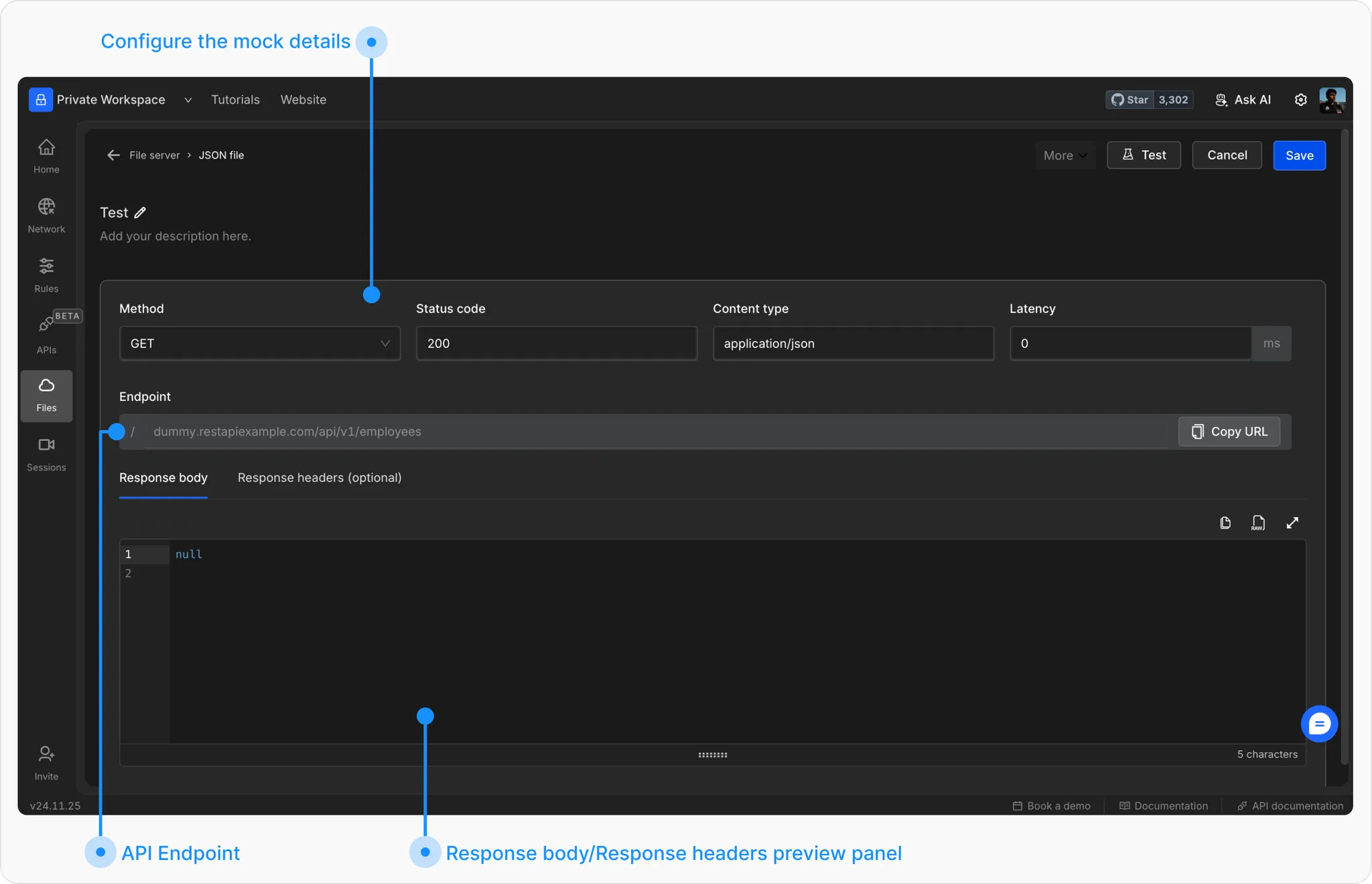 - Response Body: Add your mock JSON/text