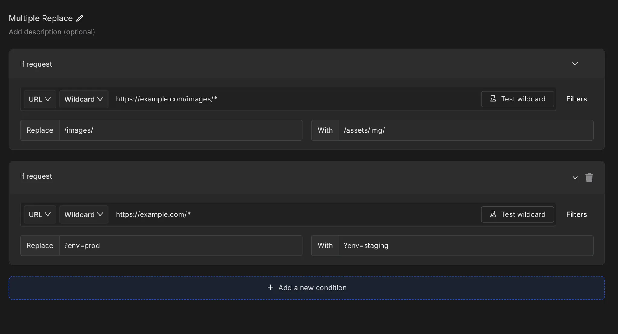 - Each condition is evaluated independently, meaning multiple replacements can be applied to the same request.