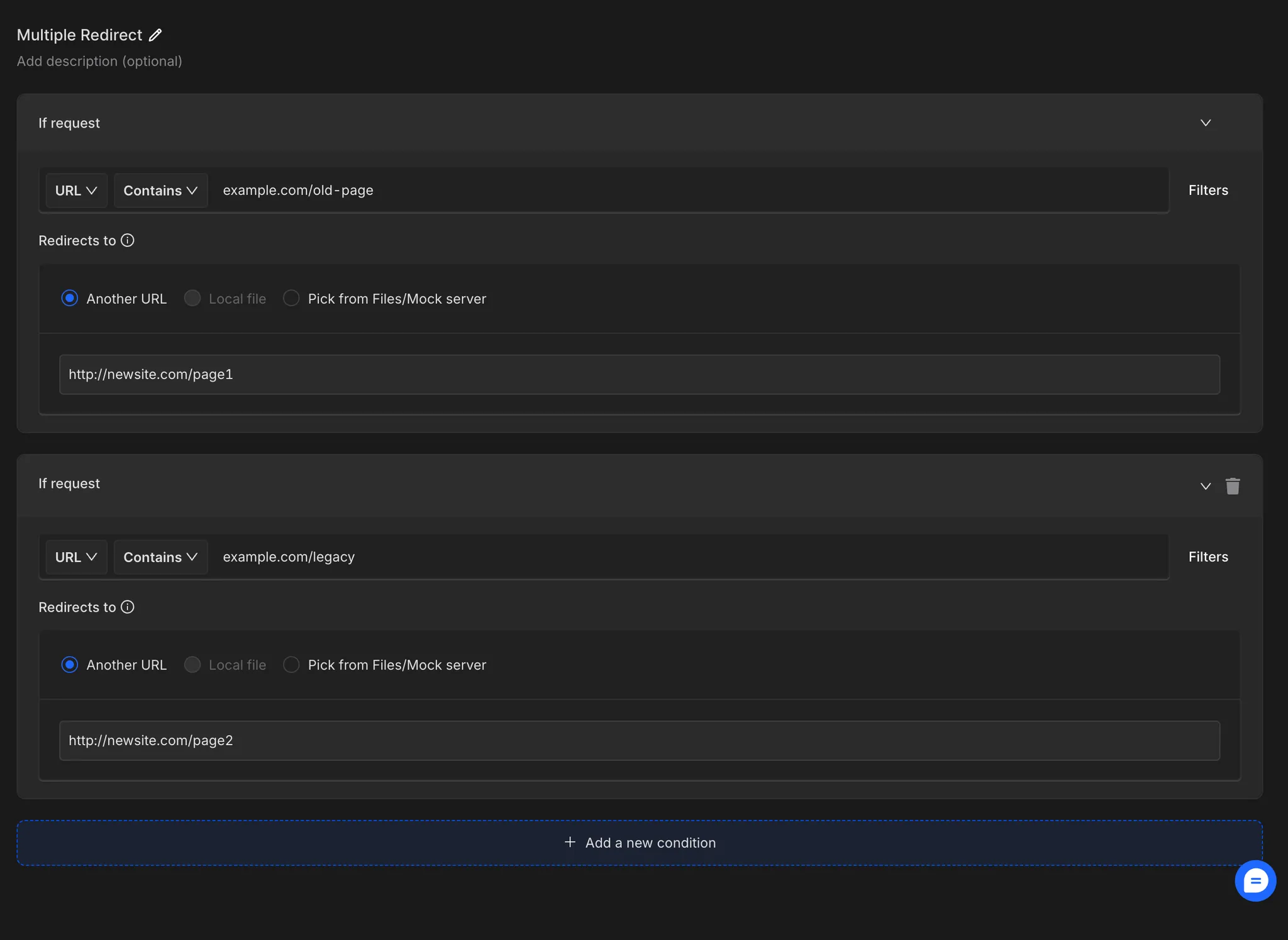 The Redirect Rule in Requestly allows users to define multiple conditions within a single rule, enabling different URLs to be redirected to different destinations. Instead of creating separate redirect rules for each URL, you can consolidate multiple redirections into one rule for better organization and efficiency.