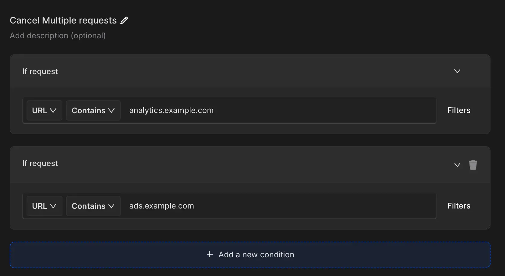 The Cancel Request Rule in Requestly allows users to define multiple conditions within a single rule to block specific requests based on different URLs. This is useful for preventing unnecessary or harmful requests, improving performance, and ensuring a cleaner browsing or testing environment.