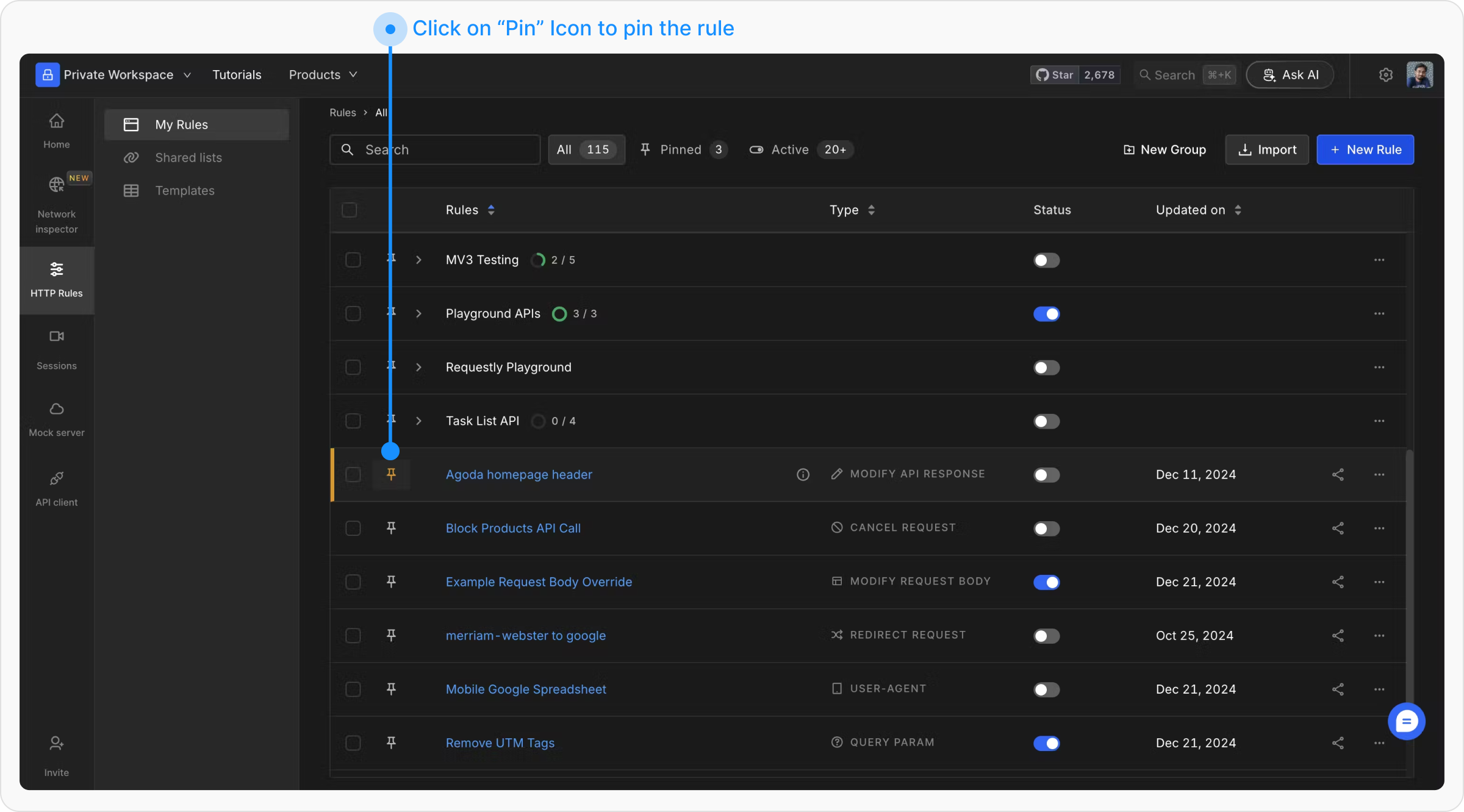 To pin a rule in Requestly, follow these steps:1
