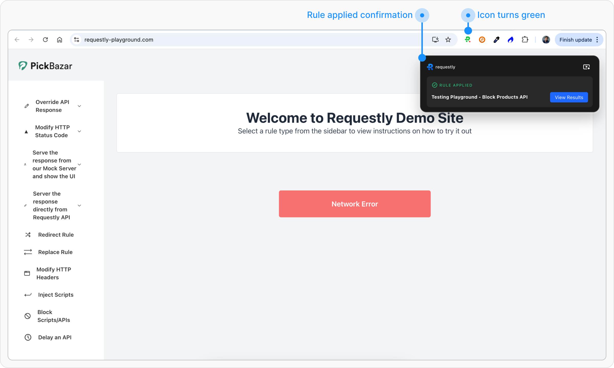 Test button and enter the URL of the page where the matching URL is called. This will open the webpage in a new tab, with a widget showing the status of applied rules.On loading the https://www.requestly-playground.com/ website, it shows network error. A small widget on the page confirms that the Rule is applied. You can click on View Results button to view the result details.