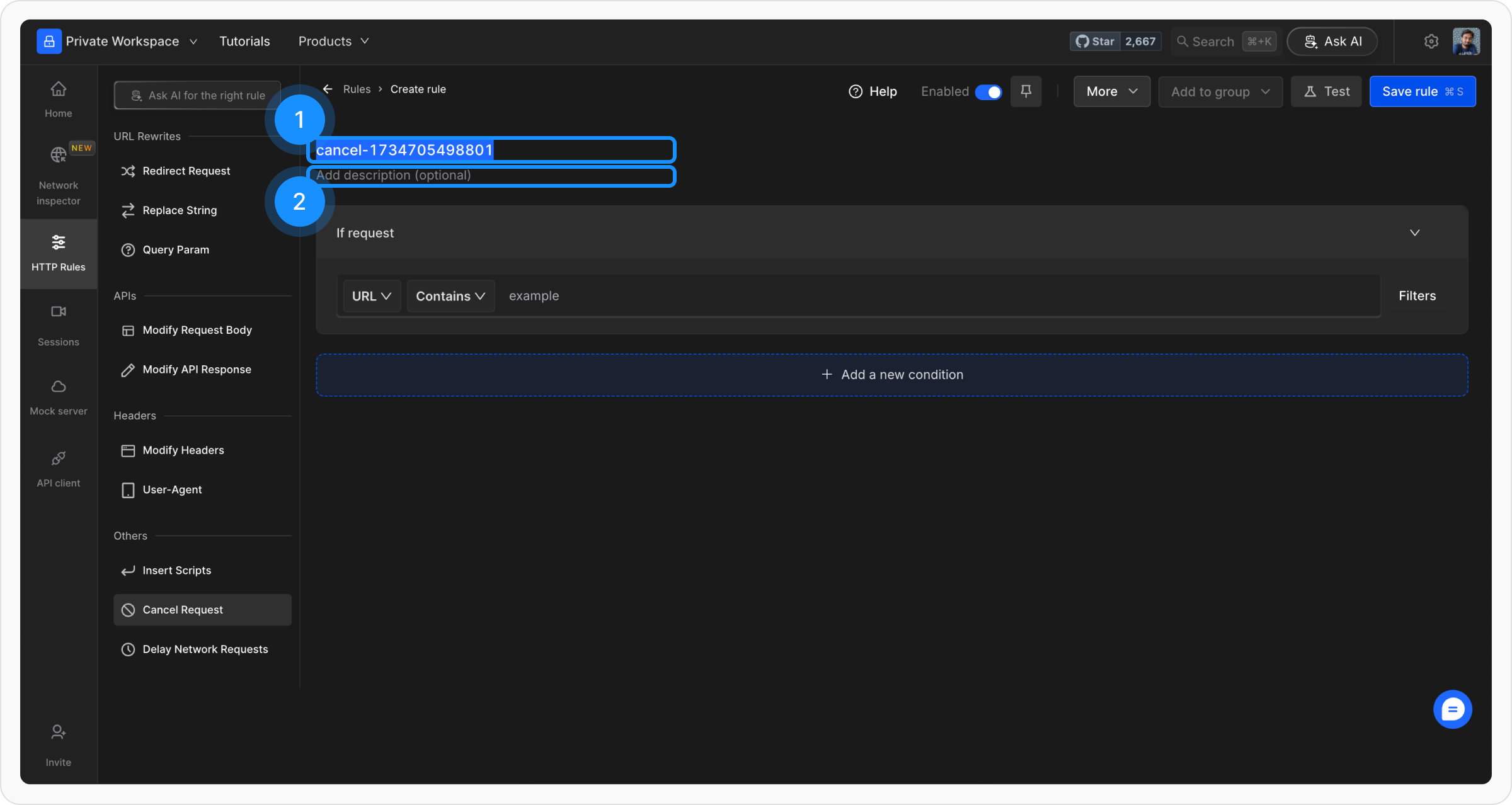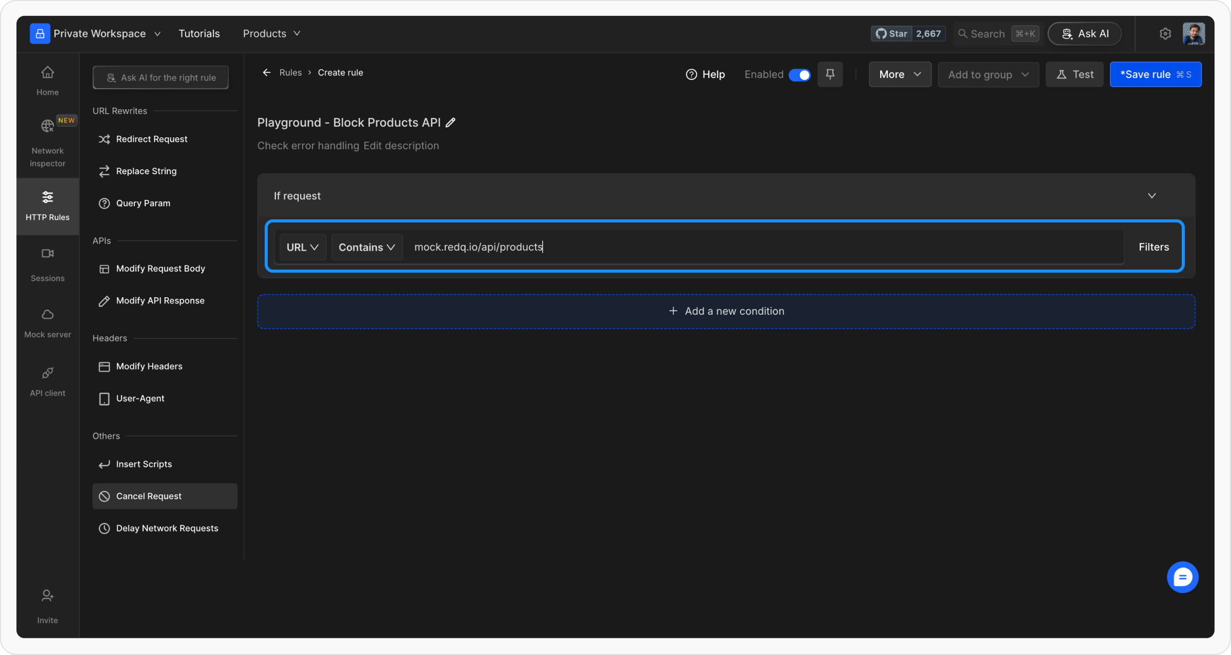 Once you have configured the conditions and filters, save the rule and toggle it on to activate. This ensures that the rule applies immediately to the specified requests.