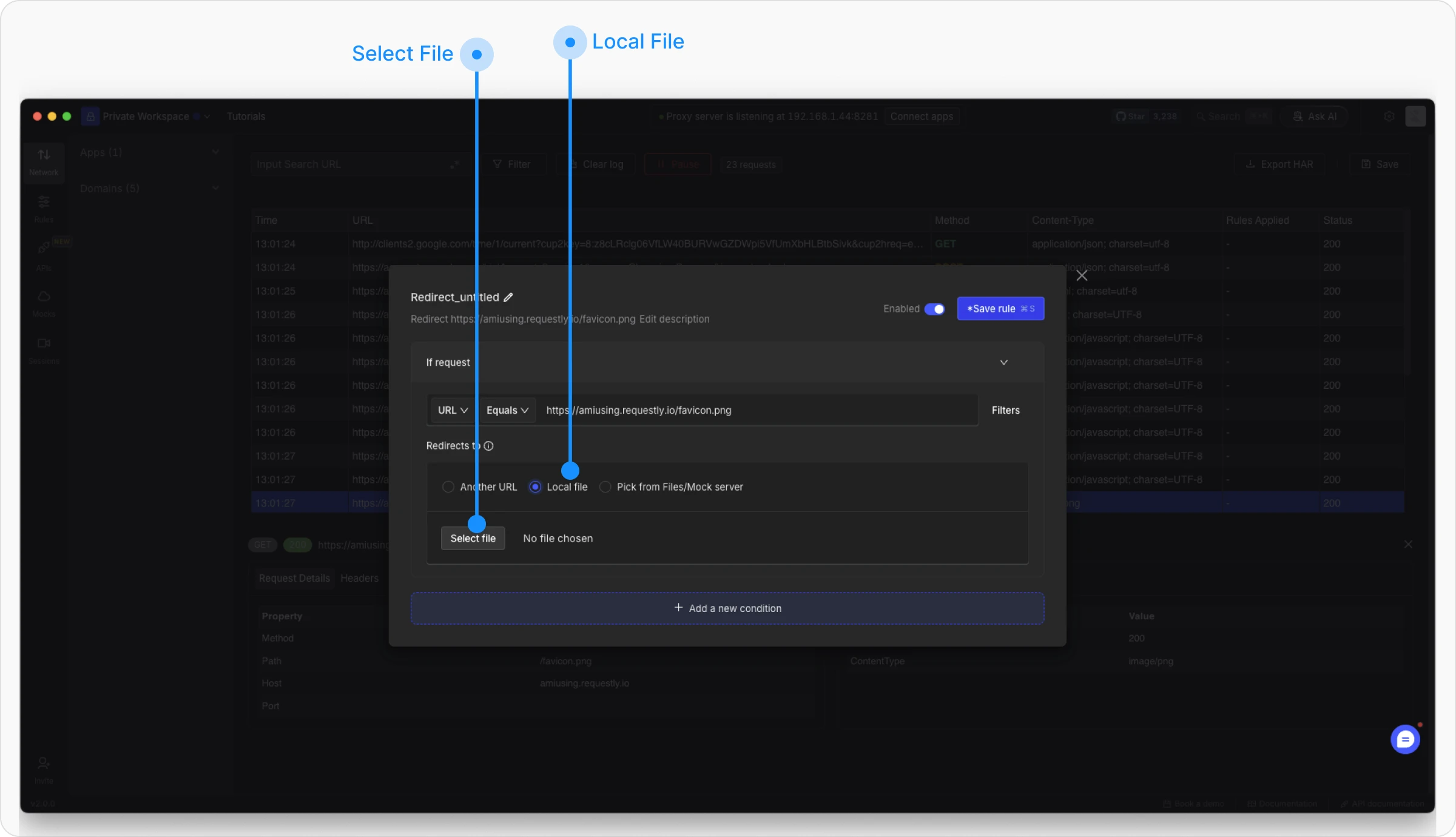 The Map Local feature in Requestly enables you to serve any local file as the response for an intercepted request in real time. This is particularly useful for testing, as you can modify the local file and immediately see the changes without deploying them to a server.