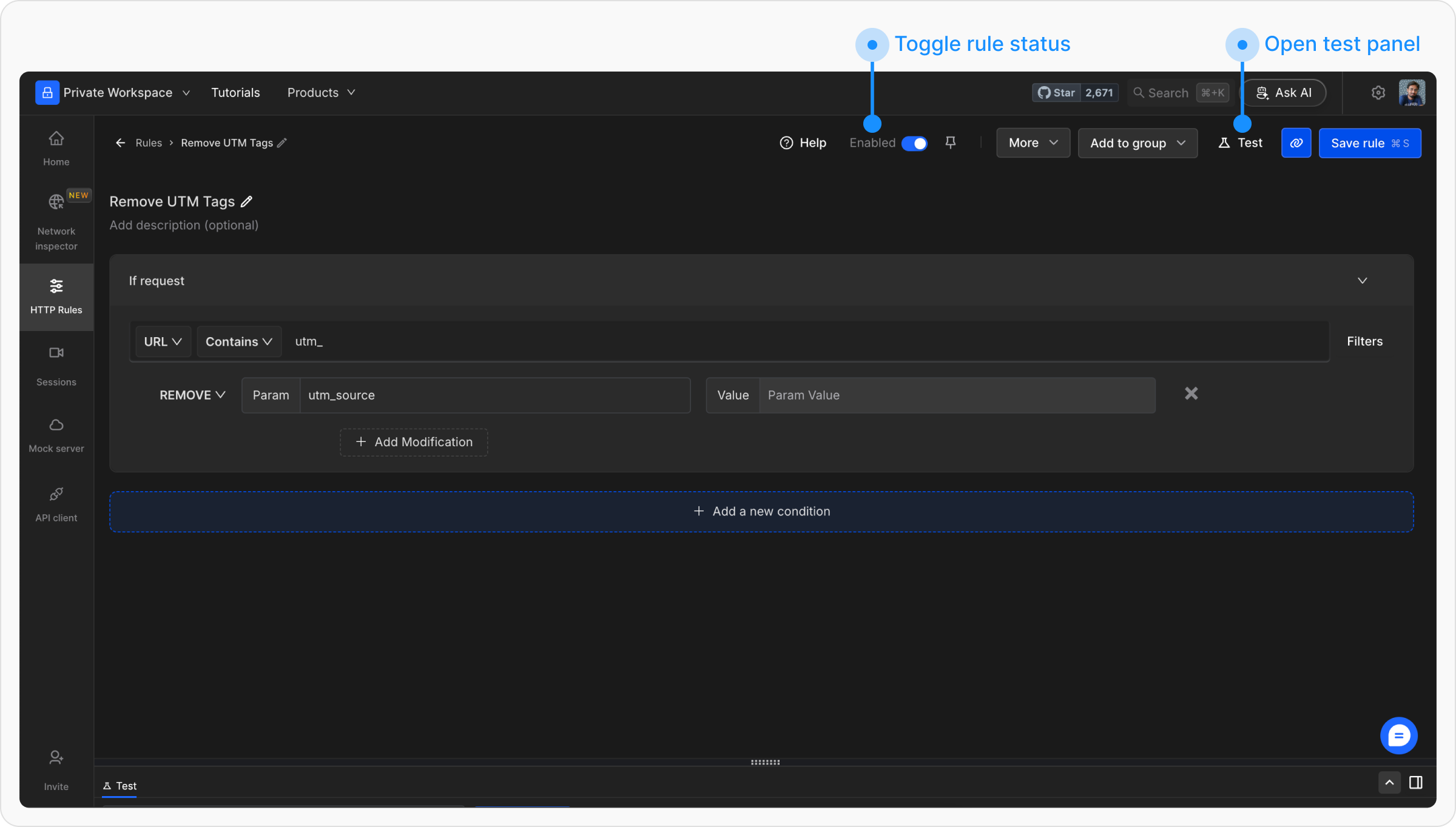 Using Requestly, you can modify the query parameters (query params) sent to the server. This includes adding new query params, updating the values of existing params, or removing specific or all query params from the URL. The following sections explain the steps and common scenarios for modifying query params.