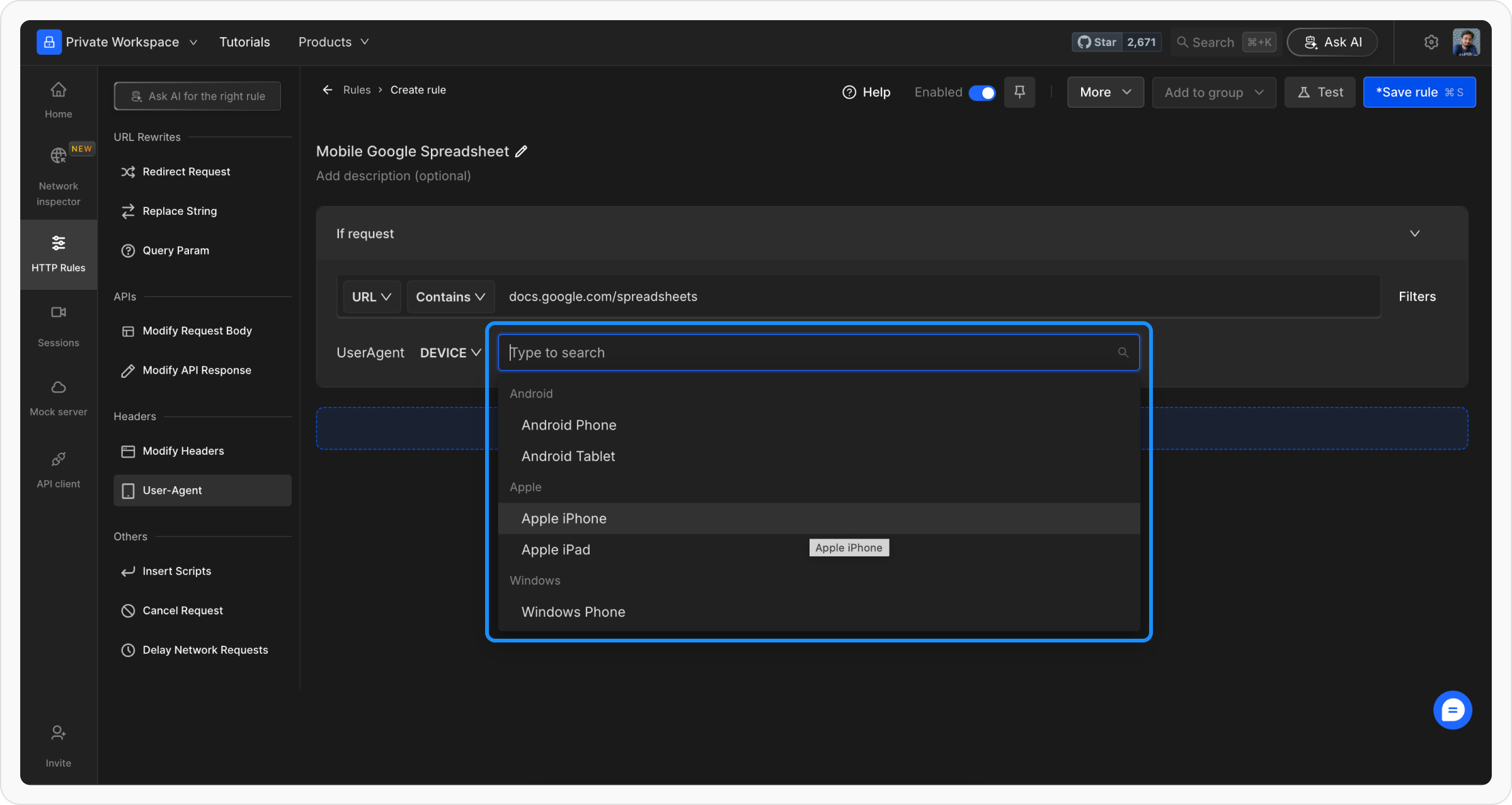 Choose whether you want to emulate a specific device or browser. Requestly provides preset options such as Android Phones, iPhones, or popular web browsers like Internet Explorer or Safari.