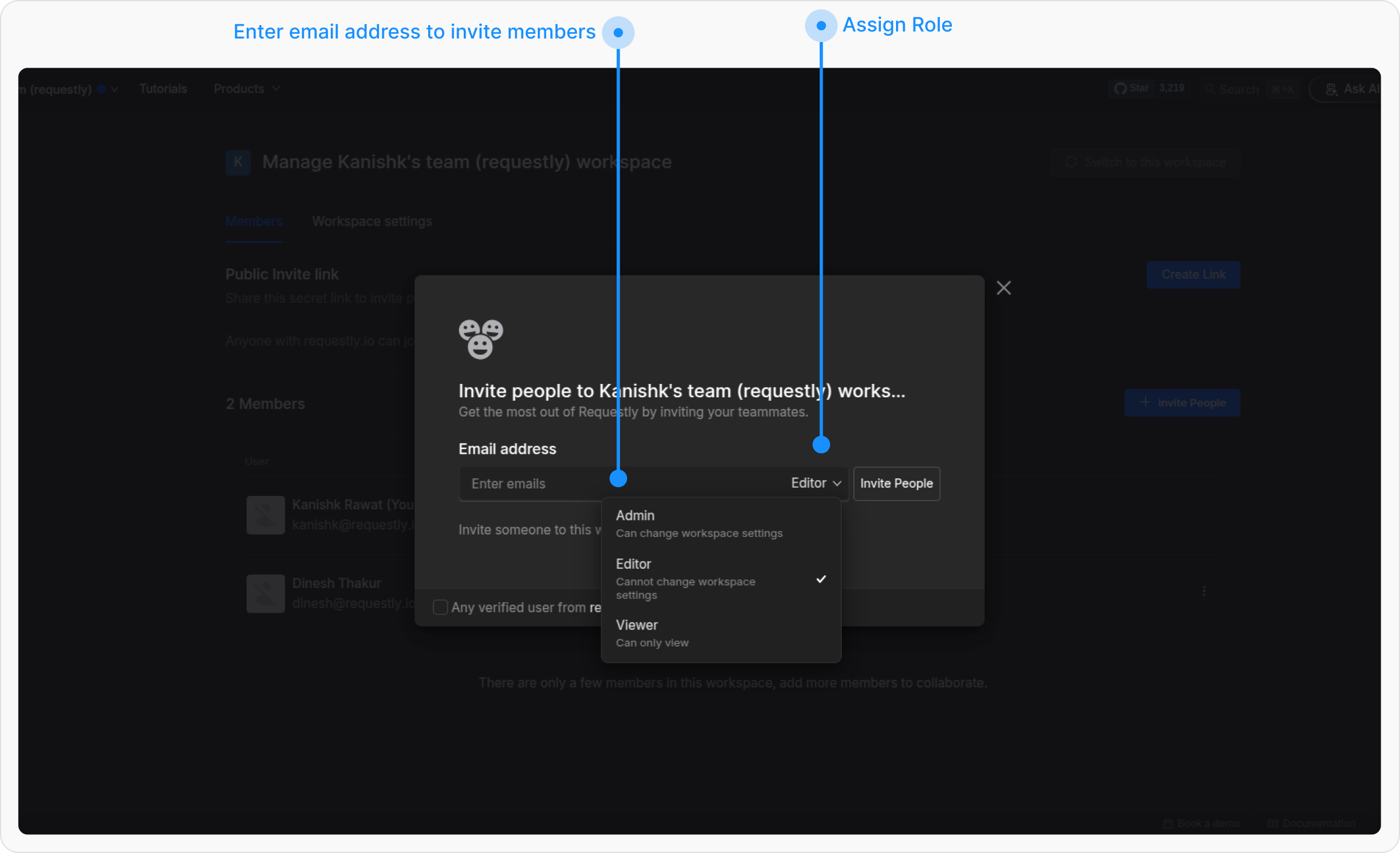 To effectively manage access, admins can add team members, update their roles, or remove team members within a workspace. Below are the steps to perform these actions.Adding New Members